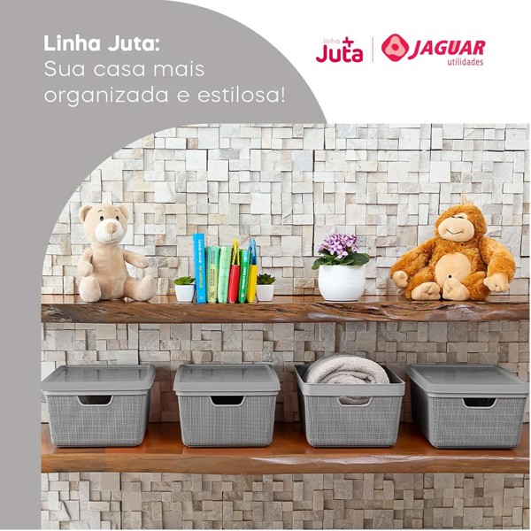A Jaguar desenvolveu a Linha Juta para facilitar tarefas do cotidiano. As caixas são elegantes com texturas que remetem a juta, proporcionando um aspecto diferenciado às caixas organizadoras. Com capacidade de 15 litros, são ideais para a organização de prateleiras e armários, oferecendo espaço adequado para armazenar diversos itens sem ocupar muito espaço. Possuem compartimento interno e tampa, o que permite manter os itens organizados.